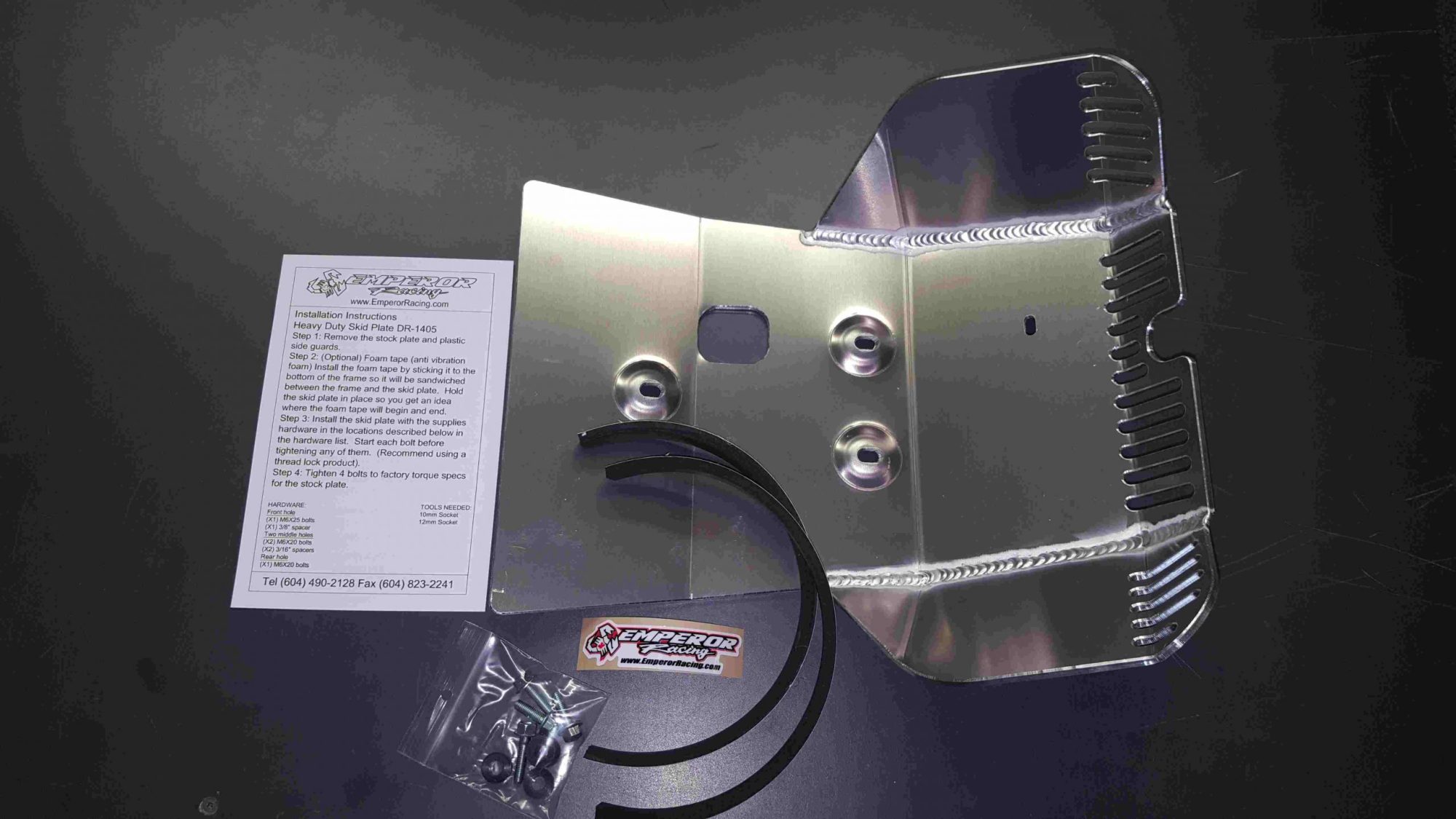 The Emperor Heavy Duty Skid Plate, in our opinion, is the best skid plate available on the market today. With a 3/16″ thick aluminum construction, hand Tig welded wings with an Emperor scorpion logo carved into each side for bling factor, aluminum mounting brackets and high-grade metric fasteners, you simply can’t go wrong. It also comes with 1/4″ thick x 3/4″ wide foam tape to place between the frame and skid plate for a nice snug fit that will eliminate any possible vibrations. This is the perfect product for the hard core off road rider.