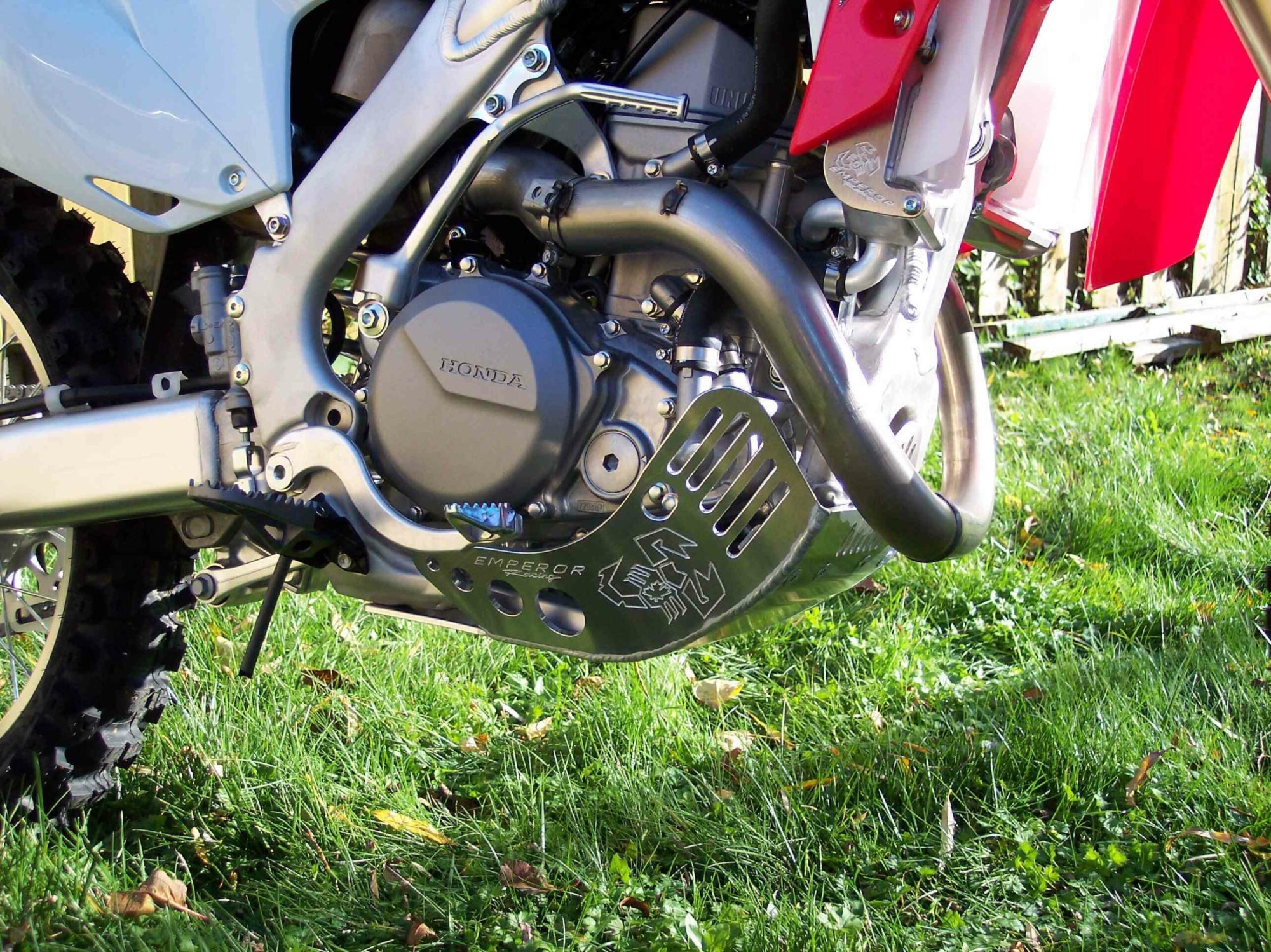 The Emperor Heavy Duty Skid Plate, in our opinion, is the best skid plate available on the market today. With a 3/16″ thick aluminum construction, hand Tig welded wings with an Emperor scorpion logo carved into each side for bling factor, aluminum mounting brackets and high-grade metric fasteners, you simply can’t go wrong. It also comes with 1/4″ thick x 3/4″ wide foam tape to place between the frame and skid plate for a nice snug fit that will eliminate any possible vibrations. And to complete the ultimate package, a block of open cell foam is also supplied to place between the skid plate and the engine to reduce the build up of material between the skid plate and engine case. This is the perfect product for the hard core off road rider.