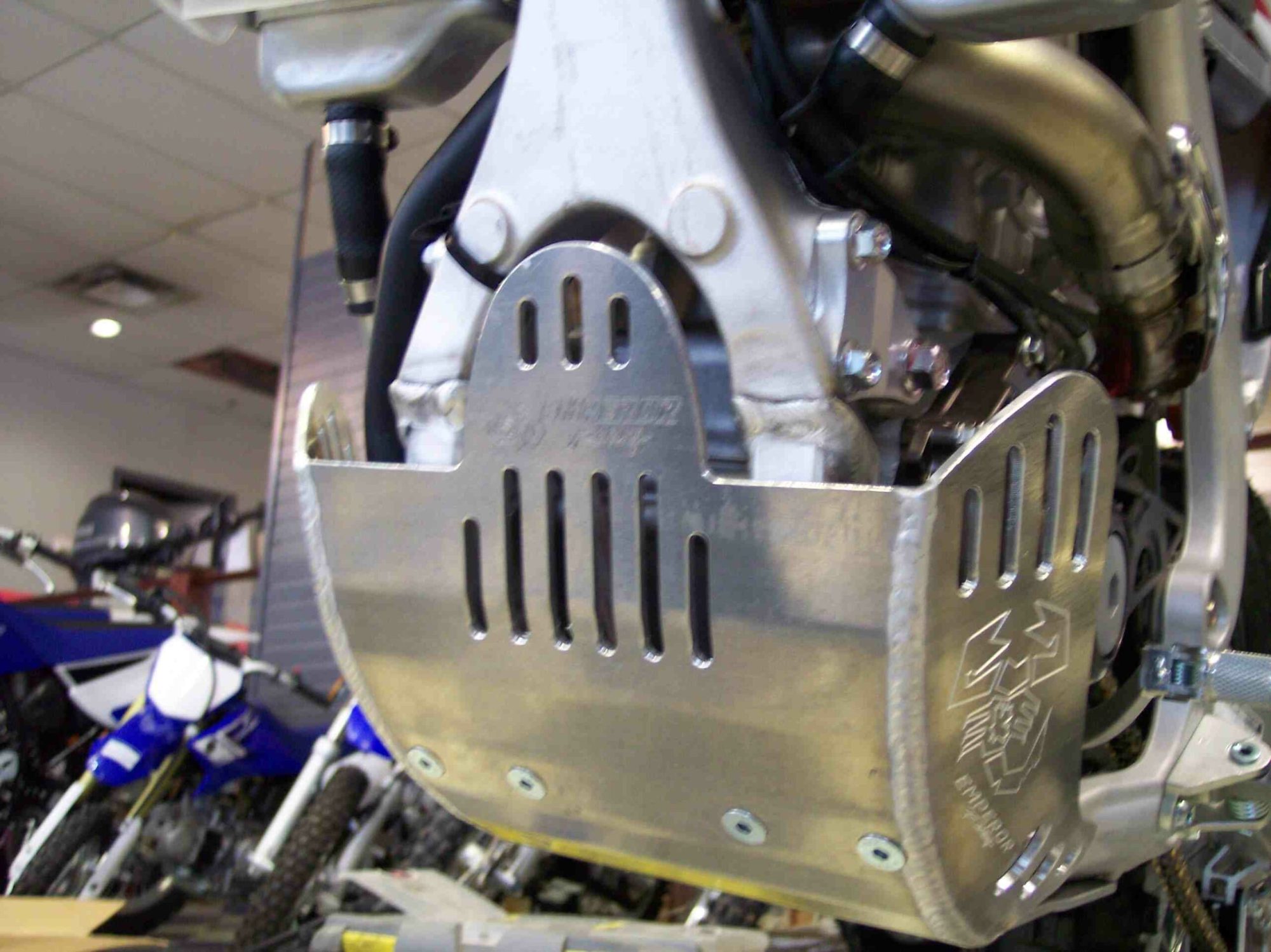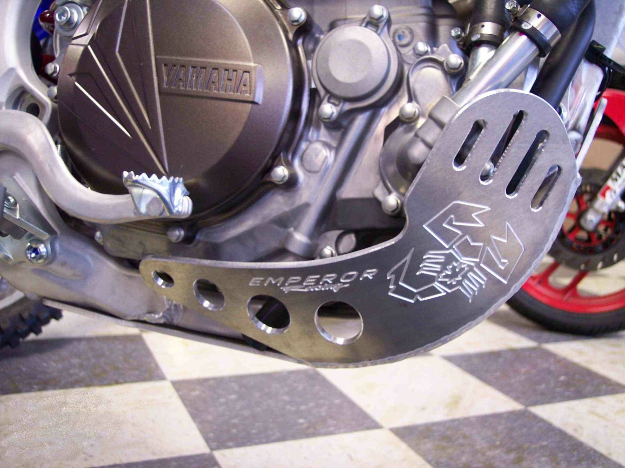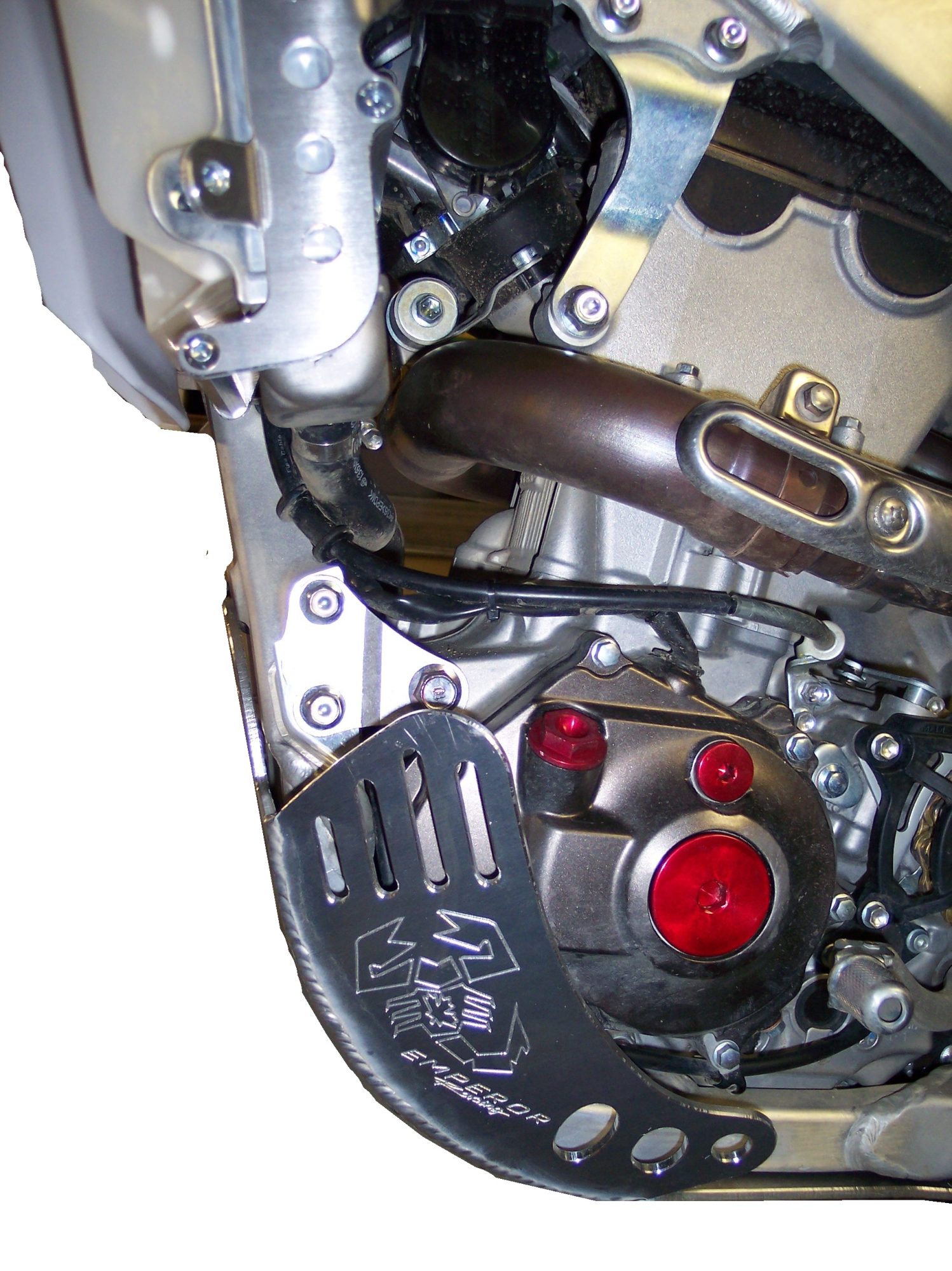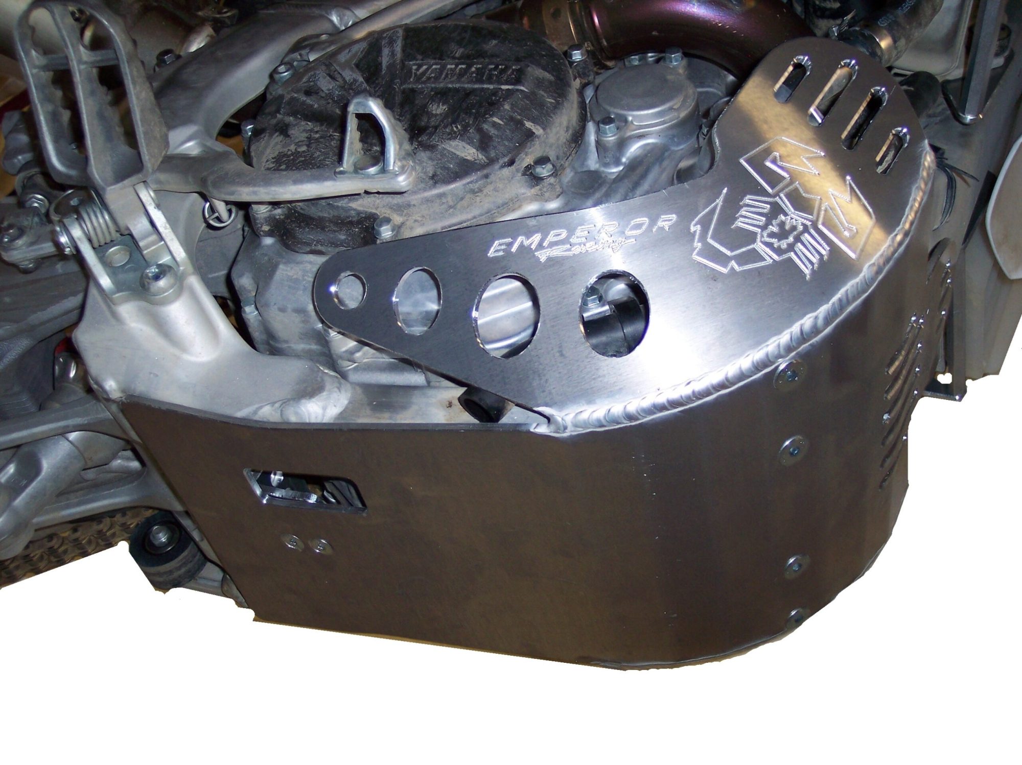 The Emperor Heavy Duty Skid Plate, in our opinion, is the best skid plate available on the market today. With a 3/16″ thick aluminum construction, hand Tig welded wings with an Emperor scorpion logo carved into each side for the bling factor, aluminum mounting brackets and high-grade metric fasteners, you simply can’t go wrong. It also comes with 1/4″ thick x 3/4″ wide foam tape to place between the frame and skid plate for a nice snug fit that will eliminate any possible vibrations. And to complete the ultimate package, a block of open cell foam is also supplied to place between the skid plate and the engine to reduce the build up of material between the skid plate and engine case. This is the perfect product for the hard core off road rider.