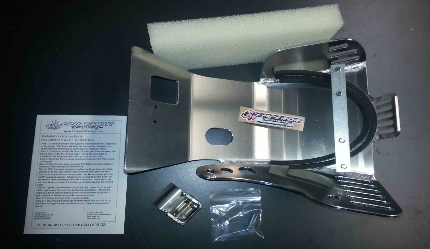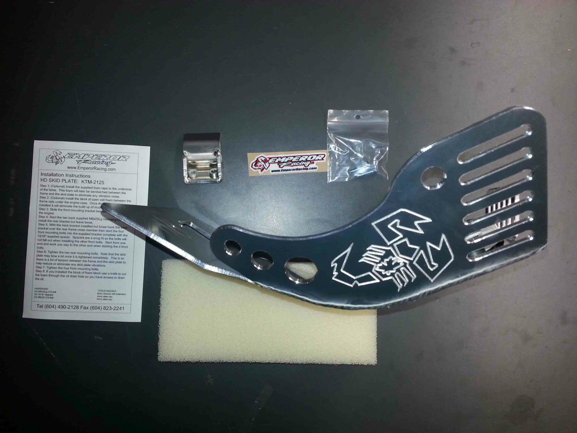 The Emperor Heavy Duty Skid Plate, in our opinion, is the best skid plate available on the market today. With a 3/16″ thick aluminum construction, hand Tig welded wings with an Emperor scorpion logo carved into each side for bling factor, aluminum mounting brackets and high-grade metric fasteners, you simply can’t go wrong. It also comes with 1/4″ thick x 3/4″ wide foam tape to place between the frame and skid plate for a nice snug fit that will eliminate any possible vibrations. And to complete the ultimate package, a block of open cell foam is also supplied to place between the skid plate and the engine to reduce the build up of material between the skid plate and engine case. This is the perfect product for the hard core off road rider.