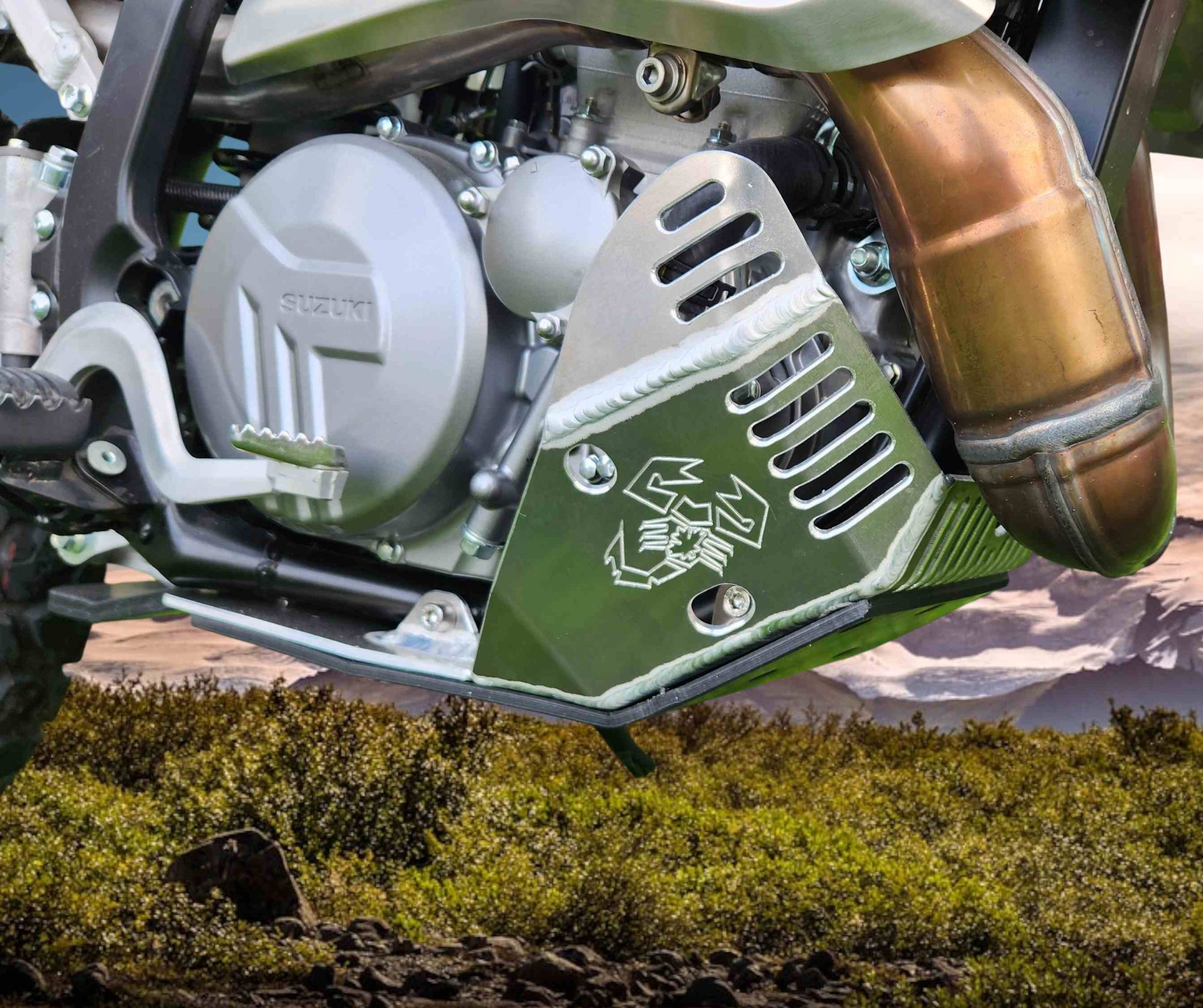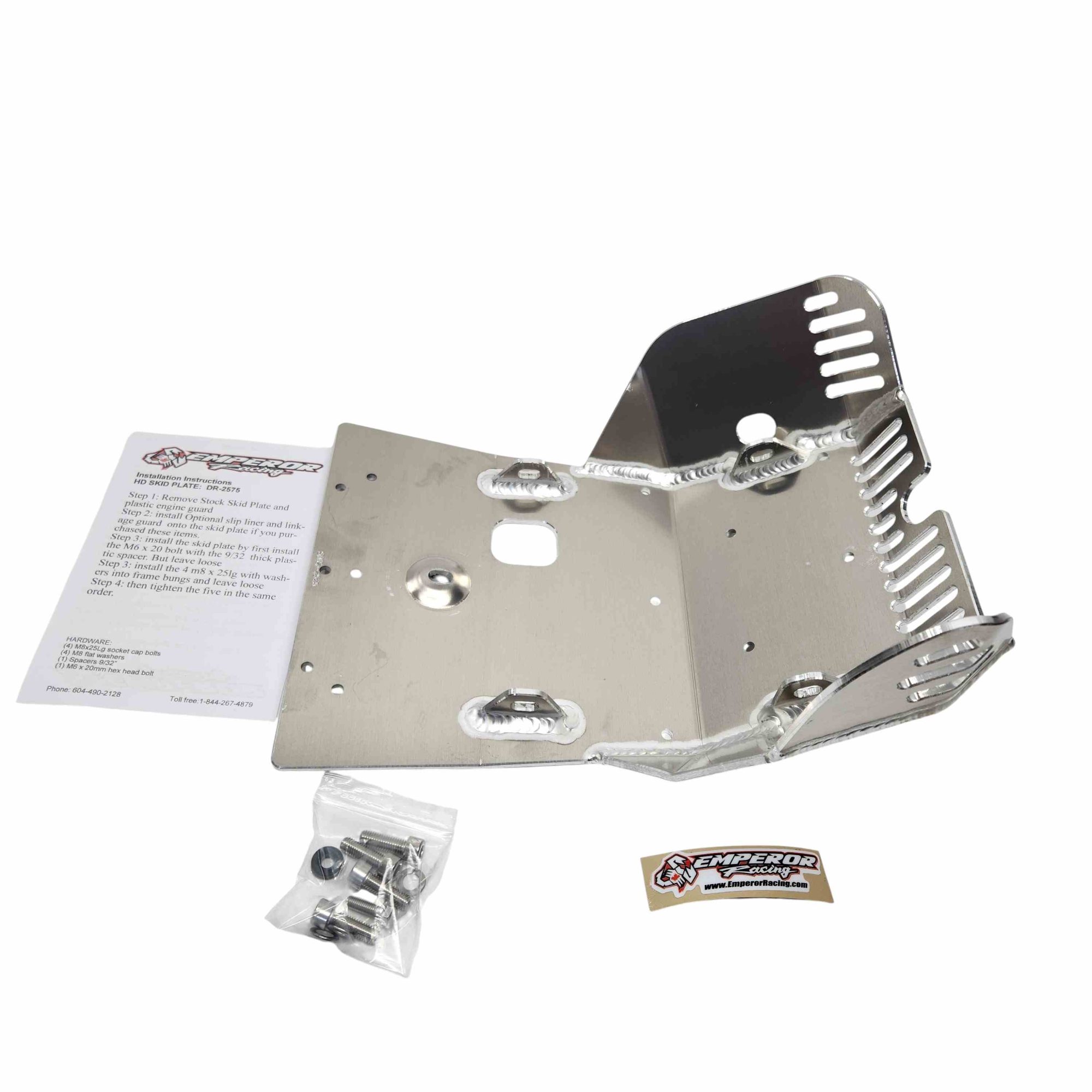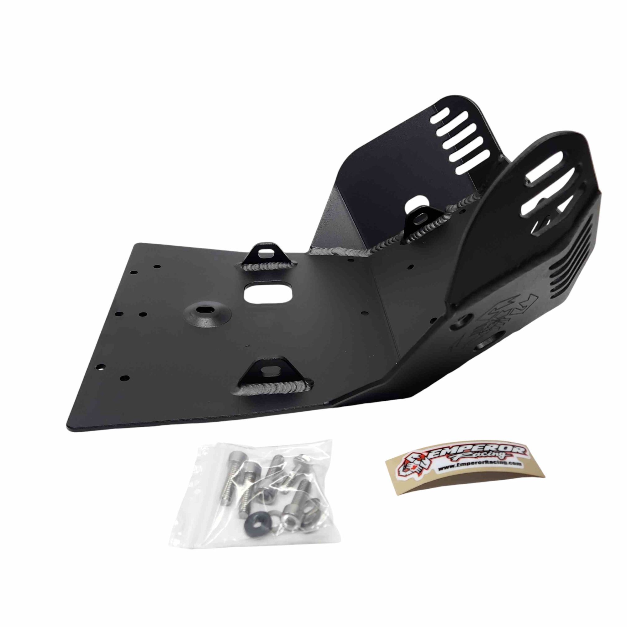 The Emperor Heavy Duty Skid Plate, in our opinion, is the best skid plate available on the market today. With a 3/16″ thick aluminum construction, hand Tig welded wings with an Emperor scorpion logo carved into each side for bling factor, aluminum mounting brackets and high-grade metric fasteners, you simply can’t go wrong. It also comes with 1/4″ thick x 3/4″ wide foam tape to place between the frame and skid plate for a nice snug fit that will eliminate any possible vibrations. This is the perfect product for the hard-core off-road rider.