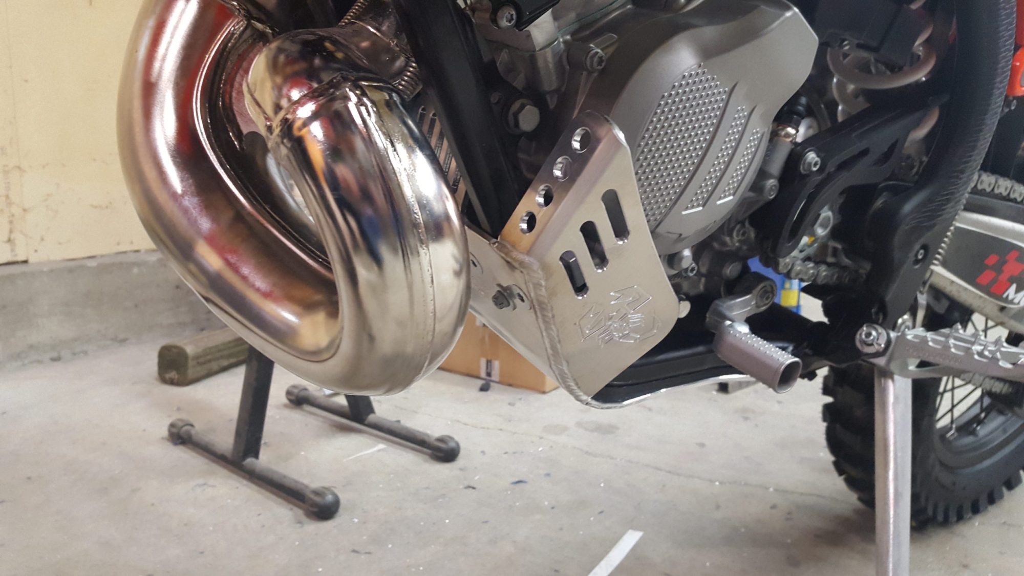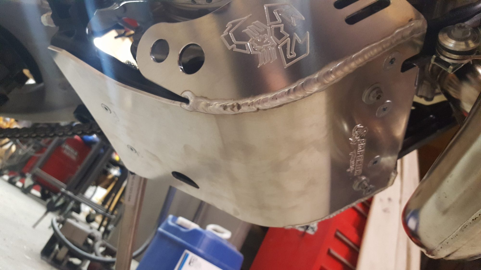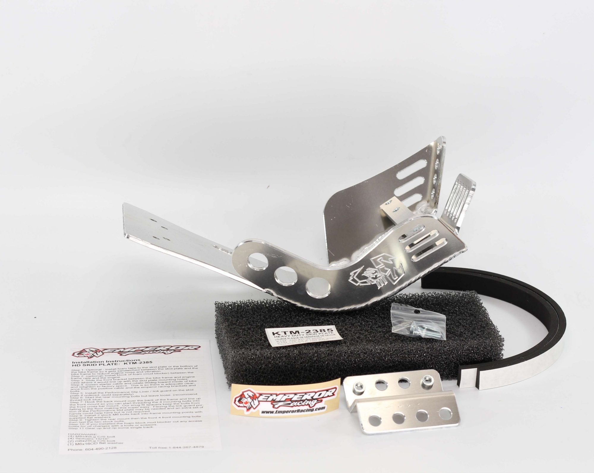 The Emperor Heavy Duty Skid Plate, in our opinion, is the best skid plate available on the market today. With a 3/16″ thick aluminum construction, hand Tig welded wings with an Emperor scorpion logo carved into each side for bling factor, aluminum mounting brackets and high-grade metric fasteners, you simply can’t go wrong. It also comes with 1/4″ thick x 3/4″ wide foam tape to place between the frame and skid plate for a nice snug fit that will eliminate any possible vibrations. And to complete the ultimate package, a block of open-cell foam is also supplied to place between the skid plate and the engine to reduce the build-up of material between the skid plate and engine case. This is the perfect product for the hardcore off-road rider.