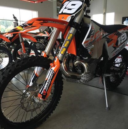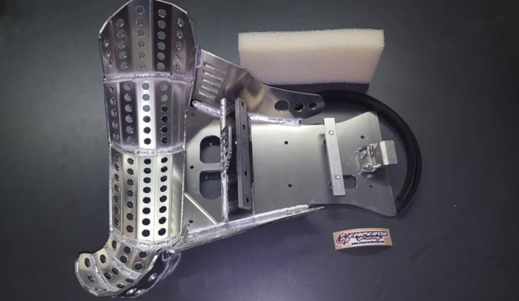 DESIGNED FOR THE STOCK KTM PIPE The Emperor Heavy Duty Pipe Guard Skid Plate is the best skid plate available on the market today. With a 3/16” thick aluminum construction, hand Tig welded wings (full length both sides) with a Emperor logo carved into each side for the bling factor, aluminum mounting brackets and high-grade metric fasteners, you simply can’t go wrong. But now we have made it even better by offering a pipe guard version for all the 2 stroke fans out there. It still has all the standard extras like 1/4″ thick x 3/4″ wide foam tape to place between the frame and skid plate for a nice snug fit that will eliminate any possible vibrations, a block of open cell foam is also supplied to place between the skid plate and the engine to reduce the build up of material between the skid plate and engine case. This is the perfect product for the hard core 2 stroke loving off-road rider.