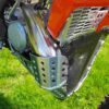 - MANUFACTURED OUT OF HIGH GRADE 3/16″ ALUMINUM MAKES THE EMPEROR HEAVY DUTY SKID PLATE ARGUABLY THE STRONGEST SKID PLATE AVAILABLE NOW WITH AN EXTENDED FRONT THAT PROTECTS THE 2 STROKE EXHAUST PIPE
