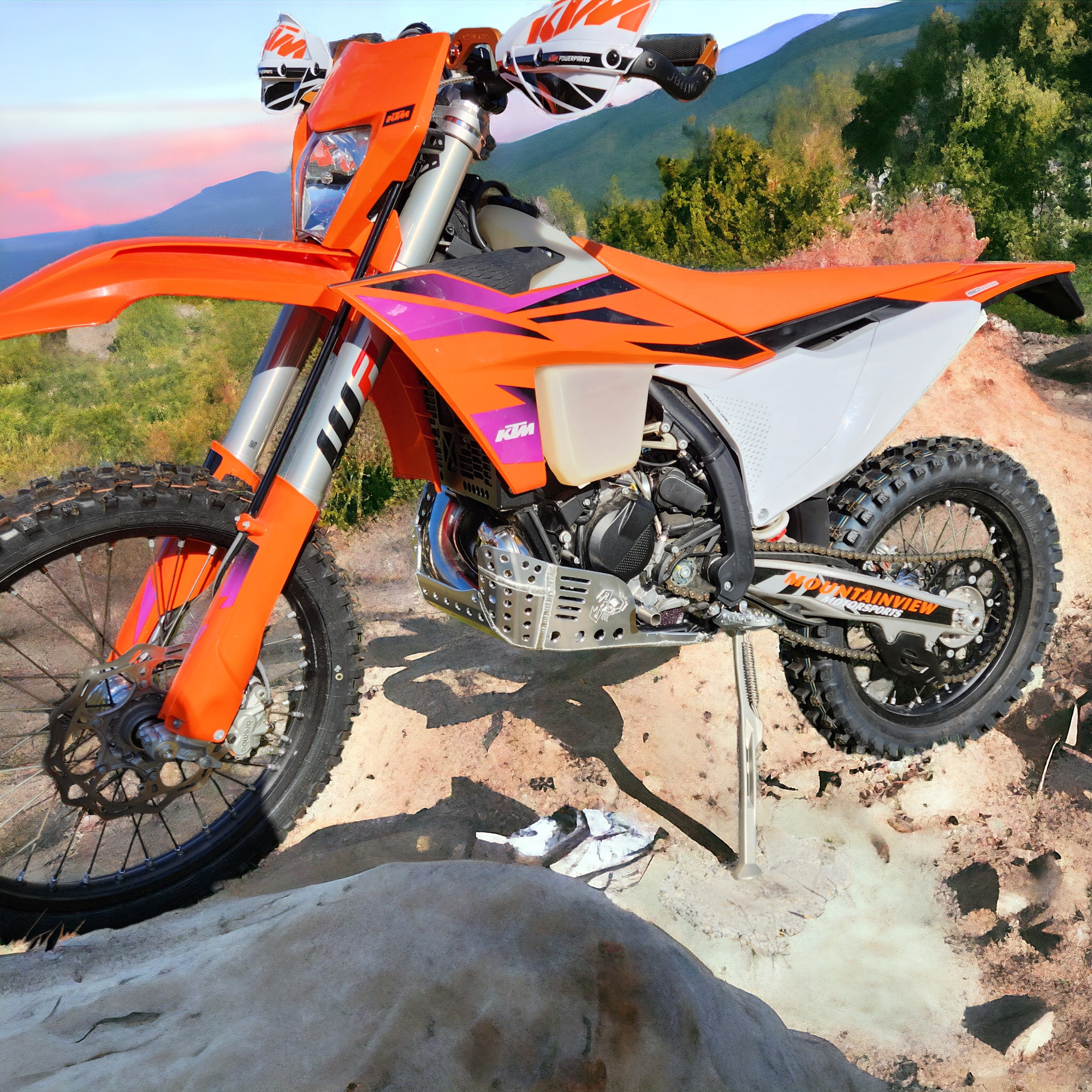 The Emperor Heavy Duty Pipe Guard Skid Plate KTM-2540 is the best skid plate available on the market today. With a 3/16” thick aluminum construction, hand Tig welded wings (full length both sides) with a Emperor logo carved into each side for the bling factor, aluminum mounting brackets and high-grade metric fasteners, you simply can’t go wrong. But now we have made it even better by offering a pipe guard version for all the 2 stroke fans out there. It still has all the standard extras like 1/4″ thick x 3/4″ wide foam tape to place between the frame and skid plate for a nice snug fit that will eliminate any possible vibrations, a block of open cell foam is also supplied to place between the skid plate and the engine to reduce the build up of material between the skid plate and engine case. This is the perfect product for the hard core 2 stroke loving off-road rider.