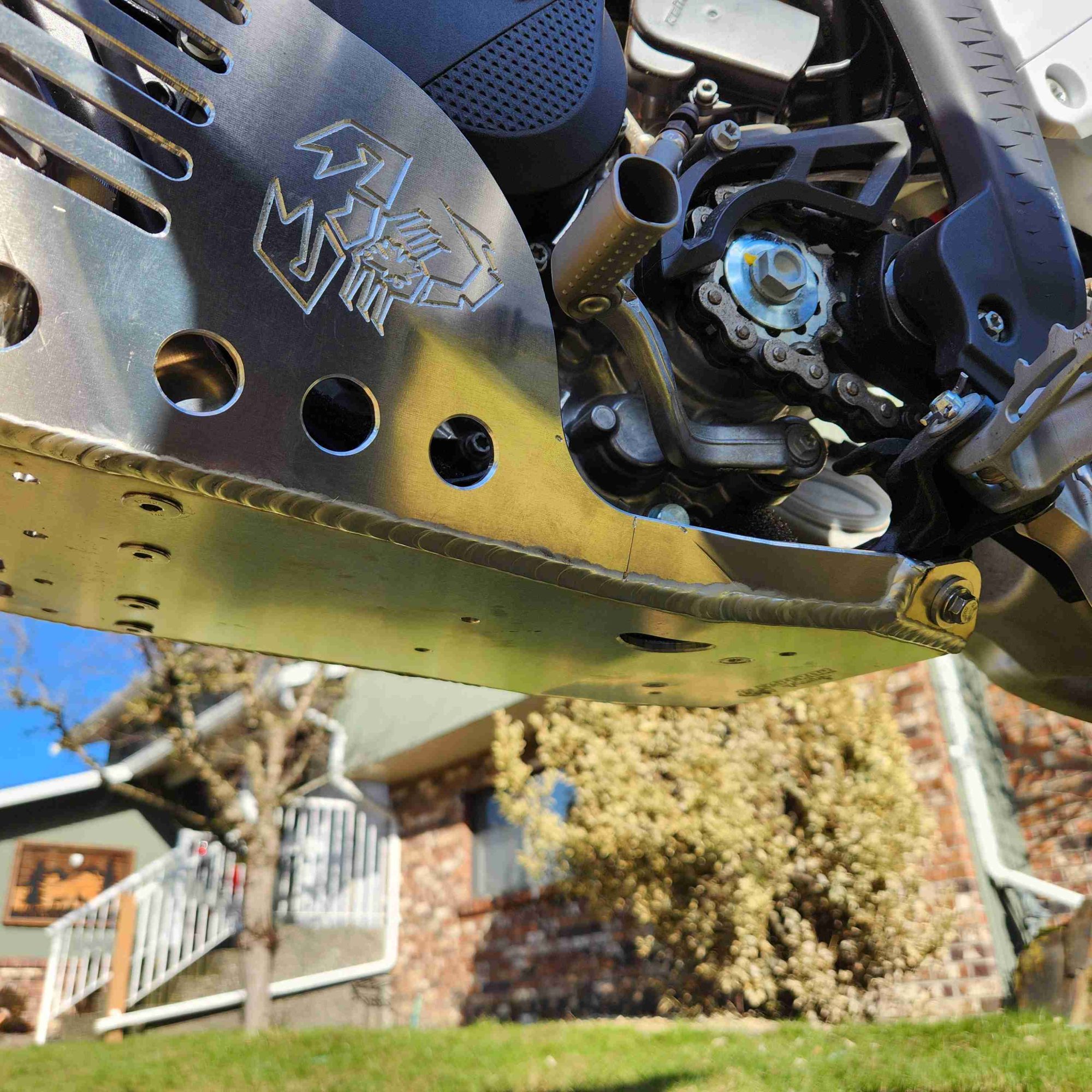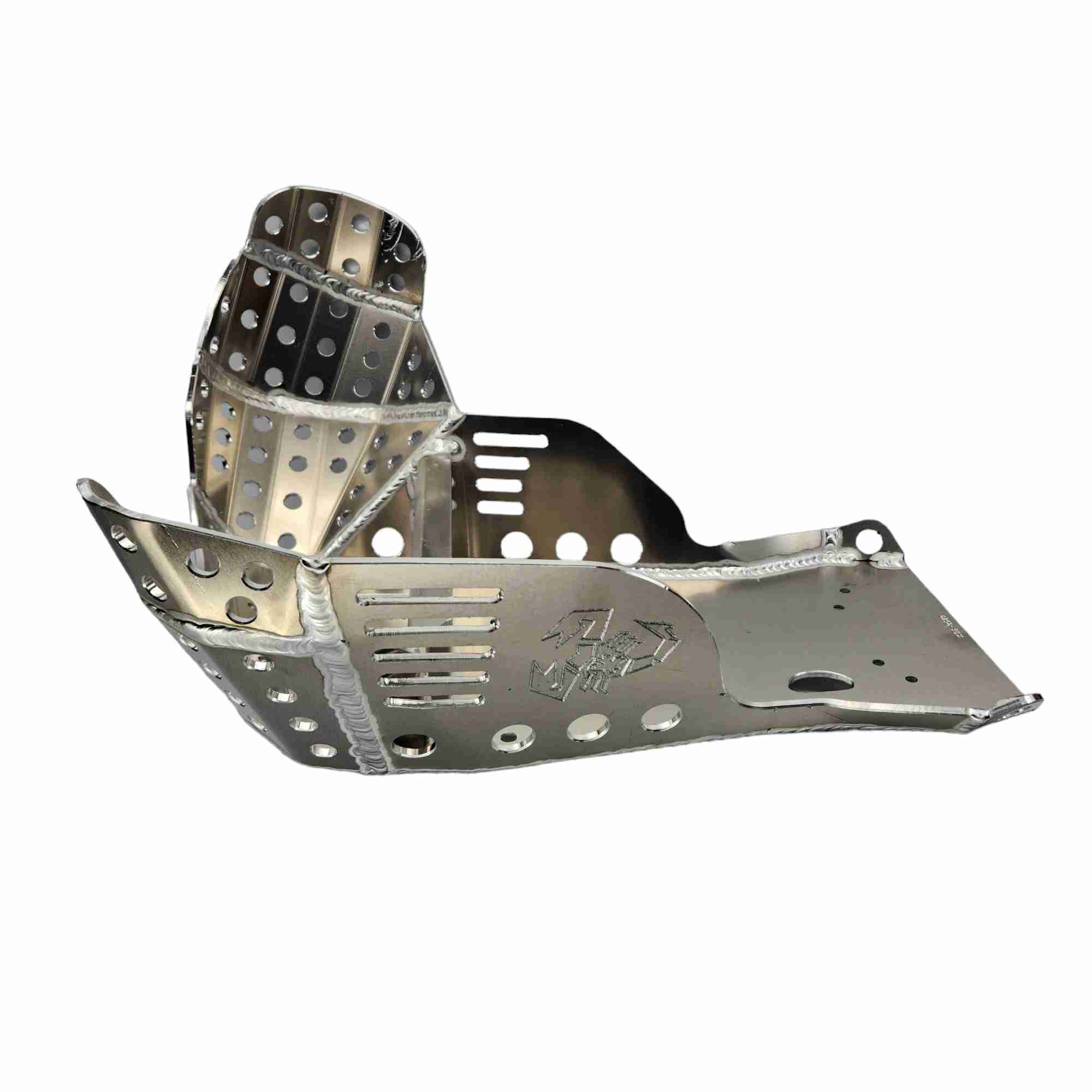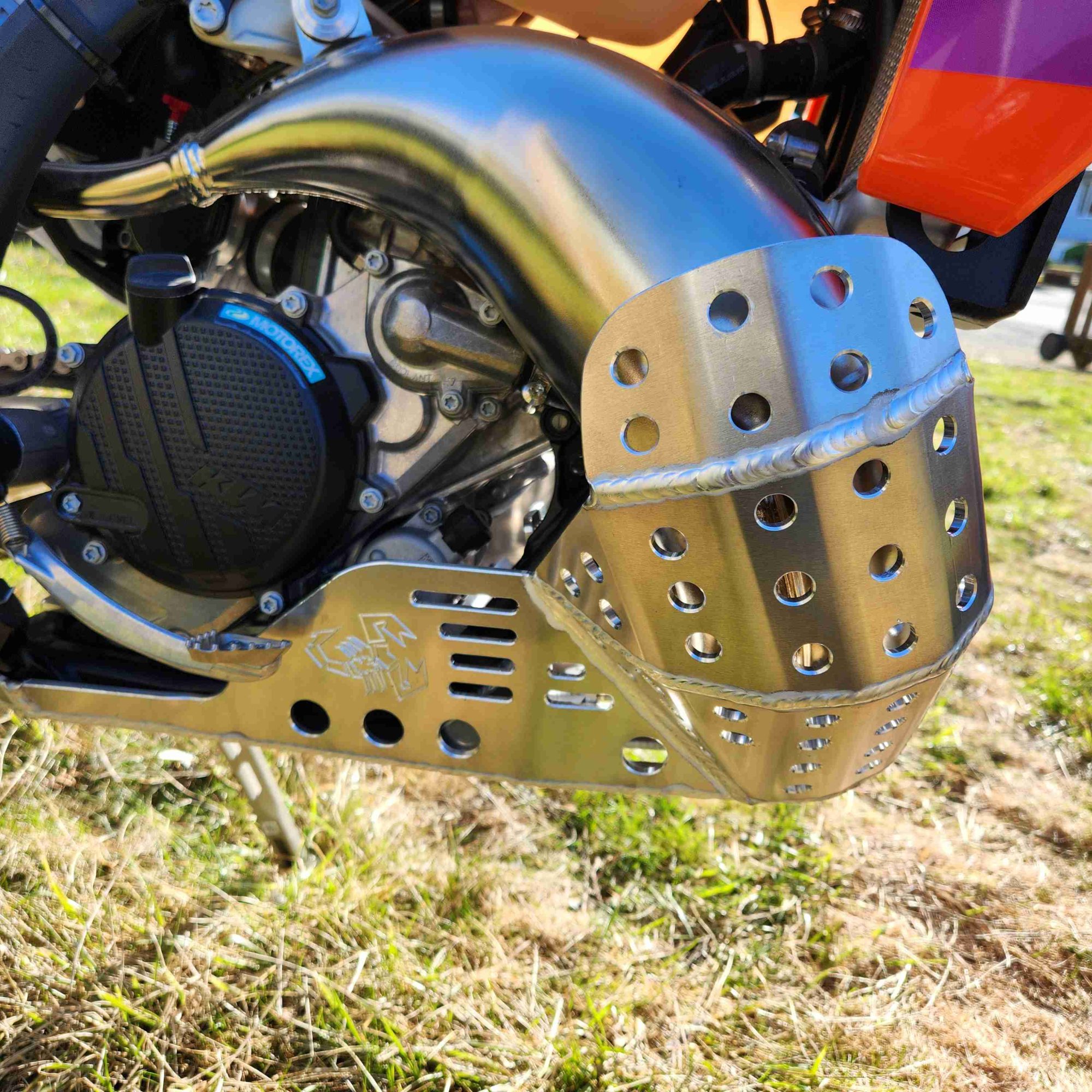 • MANUFACTURED OUT OF HIGH GRADE 3/16″ ALUMINUM MAKES THE EMPEROR HEAVY DUTY SKID PLATE ARGUABLY THE STRONGEST SKID PLATE AVAILABLE NOW WITH AN EXTENDED FRONT THAT PROTECTS THE 2 STROKE EXHAUST PIPE