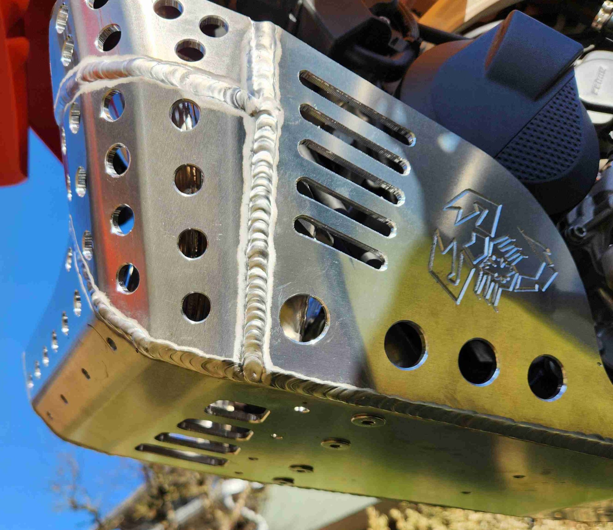 - MANUFACTURED OUT OF HIGH GRADE 3/16″ ALUMINUM MAKES THE EMPEROR HEAVY DUTY SKID PLATE ARGUABLY THE STRONGEST SKID PLATE AVAILABLE NOW WITH AN EXTENDED FRONT THAT PROTECTS THE 2 STROKE EXHAUST PIPE