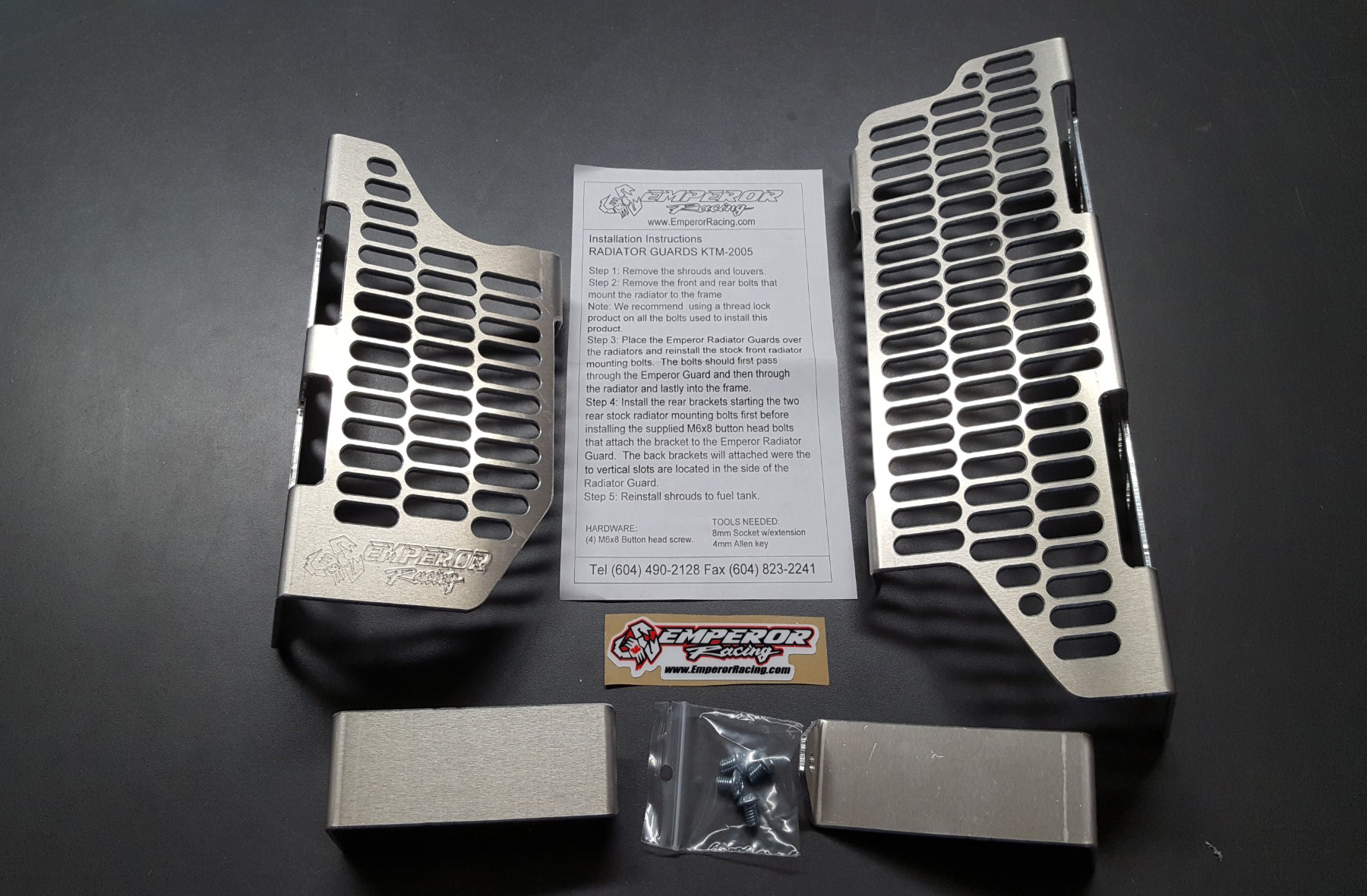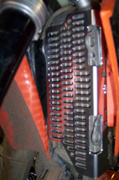 Nothing sucks more than fluids gushing out of your motorcycle in the middle of the bush, miles from rescue, just because of a poorly placed rock or tree and a little bad luck. Protect your radiator (and your bank balance) with an Emperor Radiator Guard. The Emperor Rad Guard will protect the front and side of your radiator against impact due to a crash, flying projectiles from the bike in front of you, or brush that seems to want to spear your radiator. We created a staggered horizontal punch pattern that provides maximum airflow to reduce the possibility of overheating. The best overall protection for your radiators.